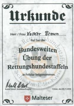 Übung "Kalter Hund" Am 25. November 2006 fand die alljährliche Übung des Deutschen Roten Kreuz in Kassel statt, die allen unter dem Namen "Kalter Hund" bekannt ist. Da unsere Rettungshundestaffel auch zu Einsätzen nach Kassel und den Landkreis Kassel gerufen werden kann, haben wir uns über die Einladung sehr gefreut. Besonders gefallen hat uns die Begleitung eines "Schiedsrichters", der mögliche Schwachstellen aufzeigte. Der Tag hat uns gut gefallen, danke nach Kassel !