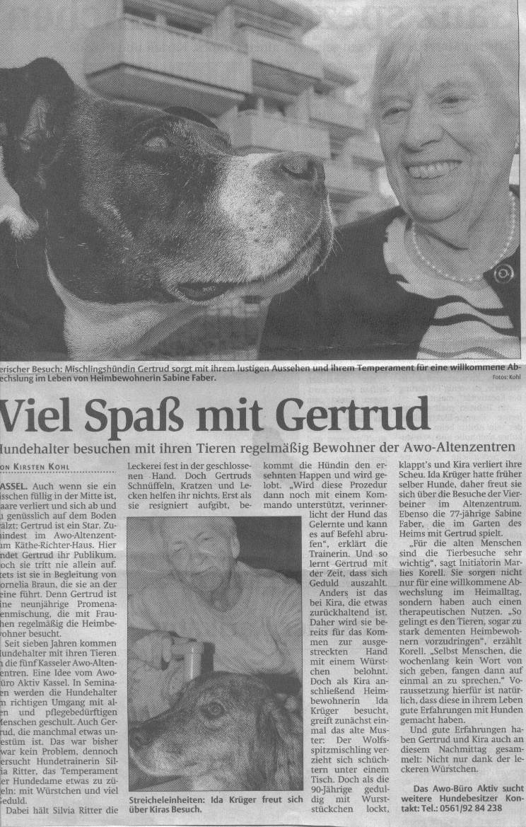 Nicht nur als geprüfter Rettungshund in der Rettungshundestaffel in Hessisch Lichtenau steht Gertrud ihren Mann. Nebenbei besucht sie mit ihrem Frauchen alte Menschen im Altersheim in Kassel und fungiert somit als eine Art "Therapiehund." Die Nähe zu Kassel ist nicht willkürlich, schließlich erfolgen Einsätze unserer Rettungshundestaffel auch in Kassel und im Landkreis Kassel.