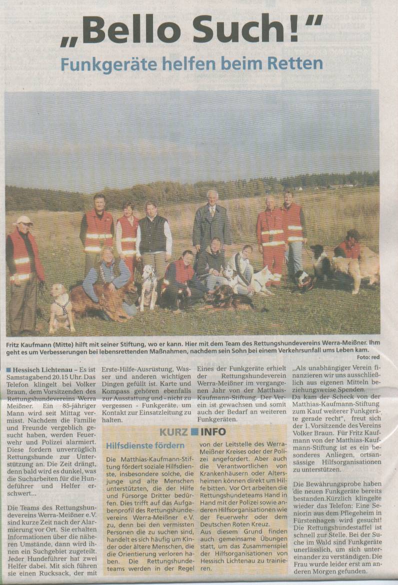 Besuch des Fernsehteams vom HR Am 5. Januar 2007 berichtete der HR in "Hessen Aktuell" über die Matthias-Kaufmann Stiftung. Diese finanzierte dem Rettungshundeverein Werra-Meißner im vergangenen Jahr 3 neue Funkgeräte. So freuten wir uns, als Fritz Kaufmann mit dem Kamerateam auch bei uns erschien und wir bei einer kurzen Suche nach einer vermissten Person unsere Arbeit vorstellen durften.
